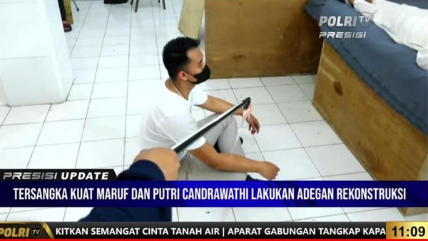 Dalam reka adegan itu, Putri Candrawathi tampak berbaring, sementara Brigadir Yosua terlihat duduk di lantai. Tak ada suara yang terdengar dari siaran langsung lokasi rekonstruksi ini. Yosua hanya terlihat duduk dan Putri tetap berbaring.