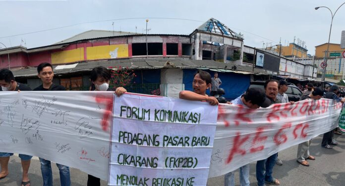 RANNEWS.CO.ID, BEKASI – Forum Komunikasi Pedagang Pasar Baru Cikarang (FKP2B) kembali lakukan aksi demonstrasi guna menolak dengan adanya rencana relokasi pasar baru Cikarang ke perumahan Grand Cikarang City (GCC) yang dilakukan pemerintah Kabupaten Bekasi (Pemkab).