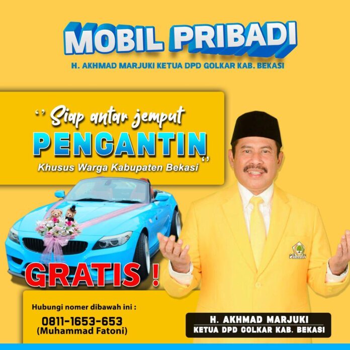 Tak tanggung tanggung Ketua DPD Golkar Kabupaten Bekasi, Marzuki memberikan mobil mewah pribadinya yaitu BMW secara gratis untuk menjadi anter jemput pengantin.