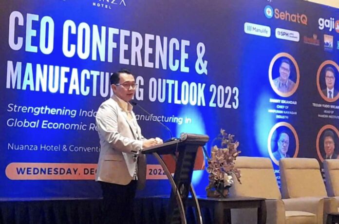 “Kami ingin industri ini menjadi motor penggerak penyerapan produk lokal, sehingga tercipta peluang bisnis, baik UMKM, Koperasi, BUMDes dan sebagainya. Kalau bisa diserap oleh industri, itu bagus sekali,” terangnya. Dani Ramdan usai memberikan sambutan dalam acara CEO Conference and Manufacturing Outlook 2023, di Nuanza Hotel, Rabu, (07/12).