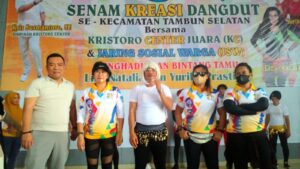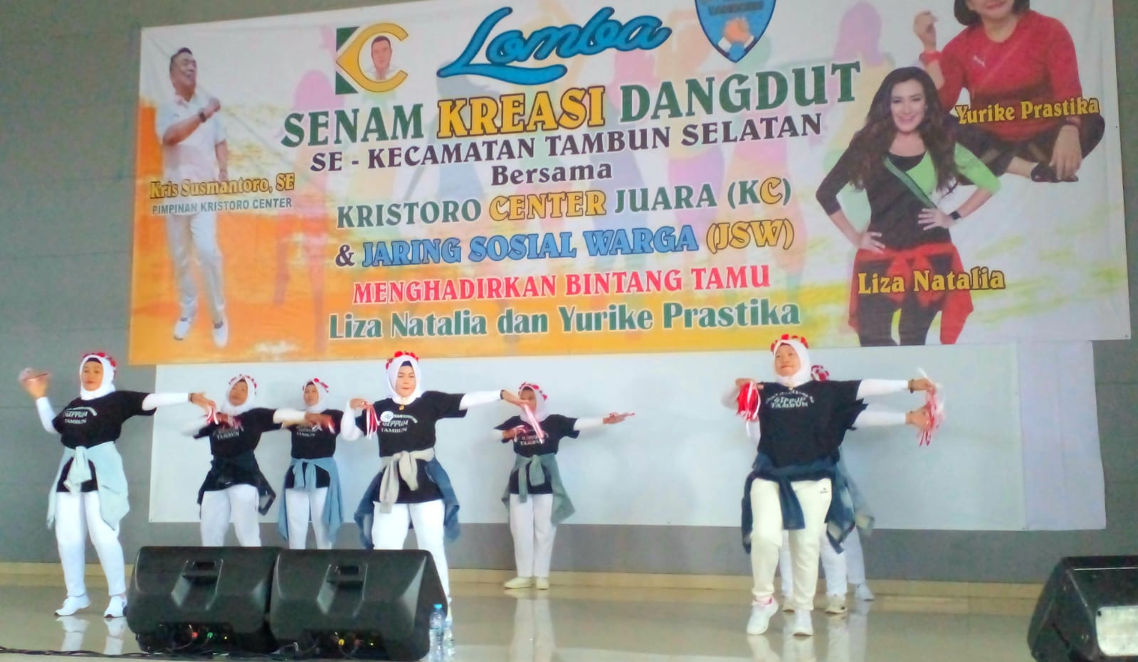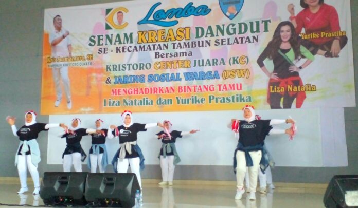 RANNEWS.CO.ID, KABUPATEN BEKASI – Kristoro Center Juara (KC) bersama Jaring Sosial Warga (JSW) melaksanakan kegiatan senam kreasi dangdut se-Kecamatan Tambun Selatan (Tamsel) yang dilaksanakan di Gedung PGRI Metland Tambun, selama dua hari Sabtu-Minggu (14-15/1/2023). Kegiatan tersebut dihadiri bintang tamu yang juga artis Liza Natalia dan Yurike Prastika.
