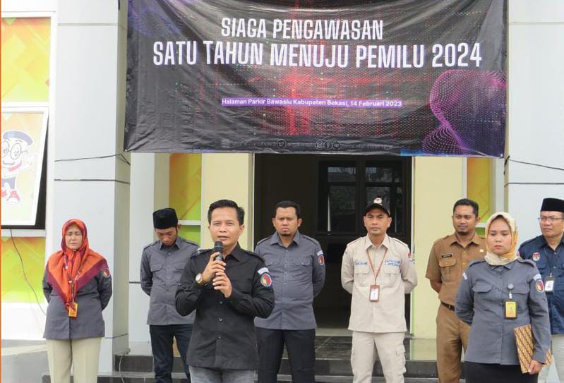 RANNEWS.CO.ID, CIKARANG UTARA – Badan Pengawas Pemilihan Umum (BAWASLU) melaksanakan kegiatan apel siaga pengawasan persiapan 1 tahun menuju pemilu 2024 di Halaman Parkir Kantor Sekretariat Bawaslu Kabupaten Bekasi, Cikarang Utara, Selasa (14/2).