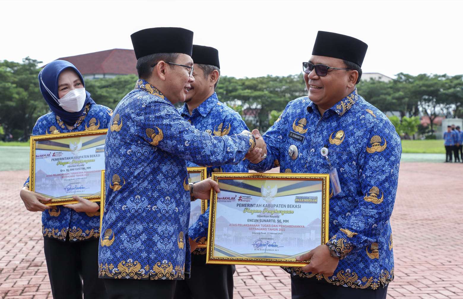Penghargaan tersebut diserahkan secara langsung oleh Penjabat Bupati Bekasi, Dani Ramdan pada Upacara Korpri dan pemberian nama-nama gedung di Komplek Pemkab Bekasi, di Plaza Pemda, Cikarang Pusatnya, pada Jumat (17/02/23).