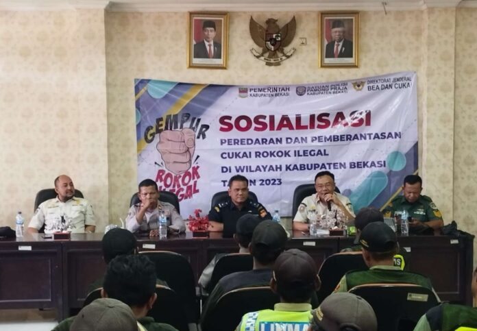 RANNEWS.CO.ID, KEDUNGWARINGIN – Satuan Polisi Pamong Praja (Satpol PP) Kabupaten Bekasi bersama Bea Cukai Cikarang menggelar sosialisasi tentang peredaran dan pemberantasan cukai rokok ilegal di wilayah Kabupaten Bekasi, yang bertempat di aula Kecamatan Kedungwaringin pada Kamis (21/09/2023).