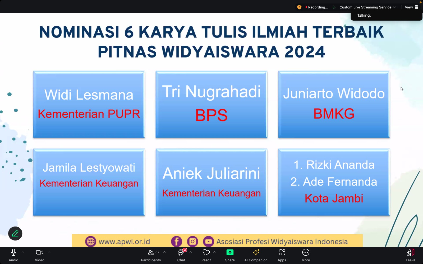 Karya tulis ilmiah dari perwakilan Kota Jambi yang bertema “Peluang dan Tantangan Kota Jambi Menuju Corporate University” berhasil menarik perhatian para juri. Penilaian tahap awal dilakukan secara virtual pada 21 Agustus 2024 oleh panel juri yang kompeten, dan saat ini perwakilan Kota Jambi telah resmi masuk dalam nominasi 6 besar terbaik.