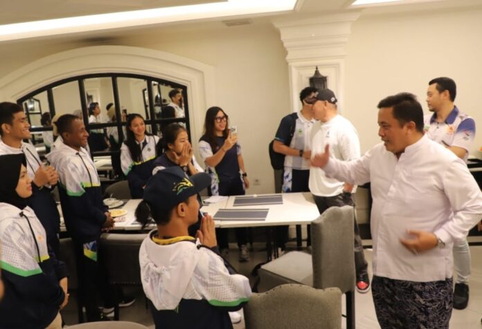 Didampingi Kadisbudpora, Iman Nugraha dan Kadiskominfosantik, Yan Yan Akhmad Kurnia, Pj Bupati Dedy Supriyadi memberikan dukungan dan semangat kepada para atlet Kabupaten Bekasi, di Le Polonia Hotel Medan, pada Jumat (13/09/2024).