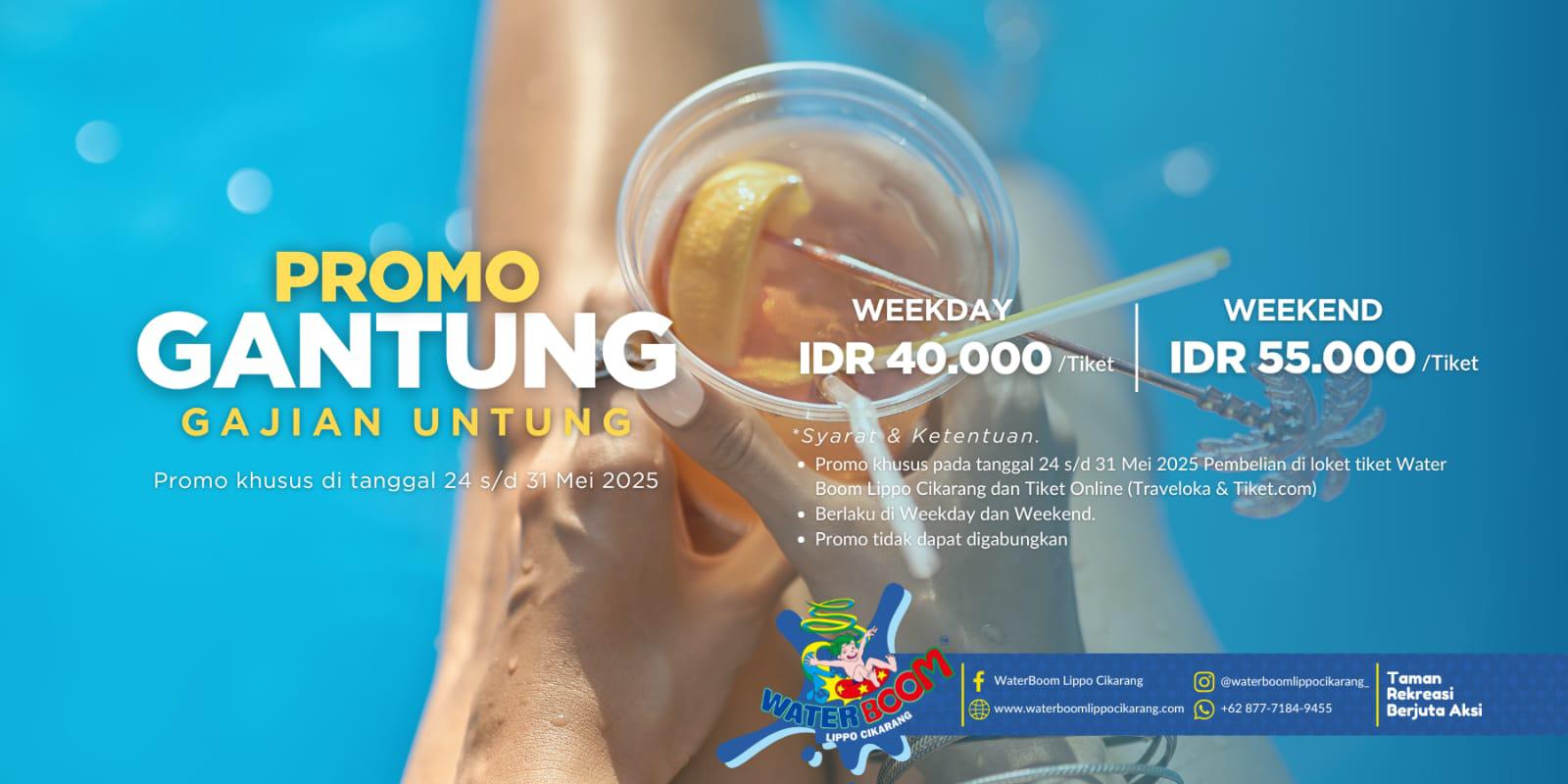 RANNEWS.CO.ID, Lippo Cikarang, 24 Mei 2025 – Momen gajian bulan ini makin seru dengan hadirnya promo spesial dari WaterBoom Lippo Cikarang bertajuk “GANTUNG” – Gajian Untung, yang berlangsung mulai tanggal 24 hingga 31 Mei 2025. Dalam promo ini, pengunjung bisa menikmati tiket masuk dengan harga super hemat: hanya Rp 40.000 untuk weekday dan Rp 55.000 untuk weekend.