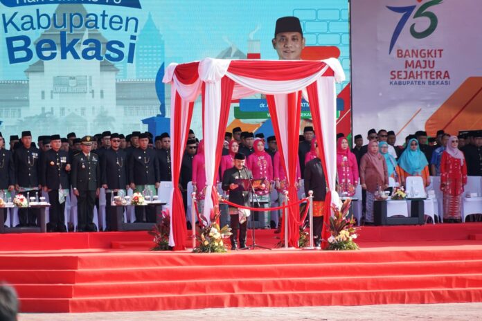 RANNEWS.CO.ID, CIKARANG PUSAT – Pemerintah Kabupaten Bekasi menggelar Upacara Peringatan Hari Jadi ke-75 Kabupaten Bekasi, bertempat di Plaza Pemkab Bekasi, Cikarang Pusat, pada Jumat (15/8). Bertindak sebagai Inspektur Upacara, Bupati Bekasi, Ade Kuswara Kunang, dihadiri Wakil Bupati Bekasi, Sekretaris Daerah Kabupaten Bekasi, unsur Forkopimda, jajaran Kepala Perangkat Daerah, tokoh agama, tokoh masyarakat, jajaran Bupati Bekasi terdahulu, serta tamu undangan lainnya.