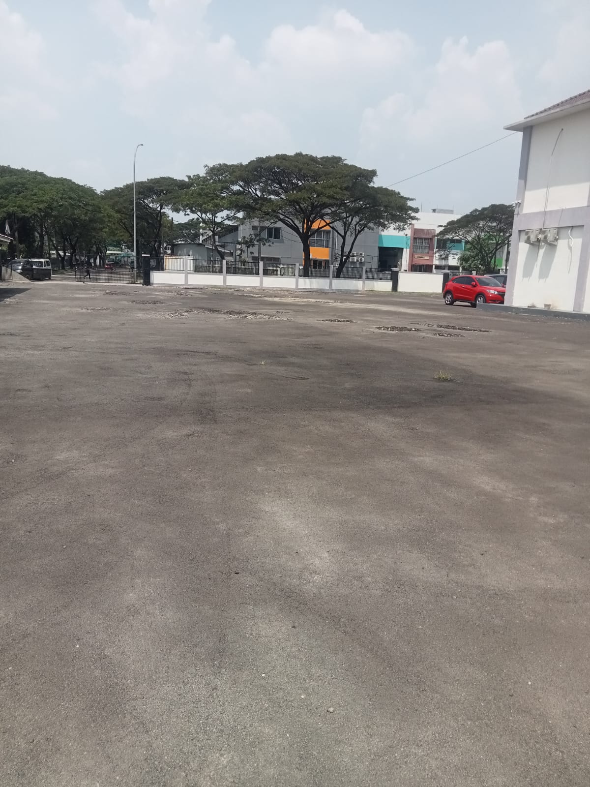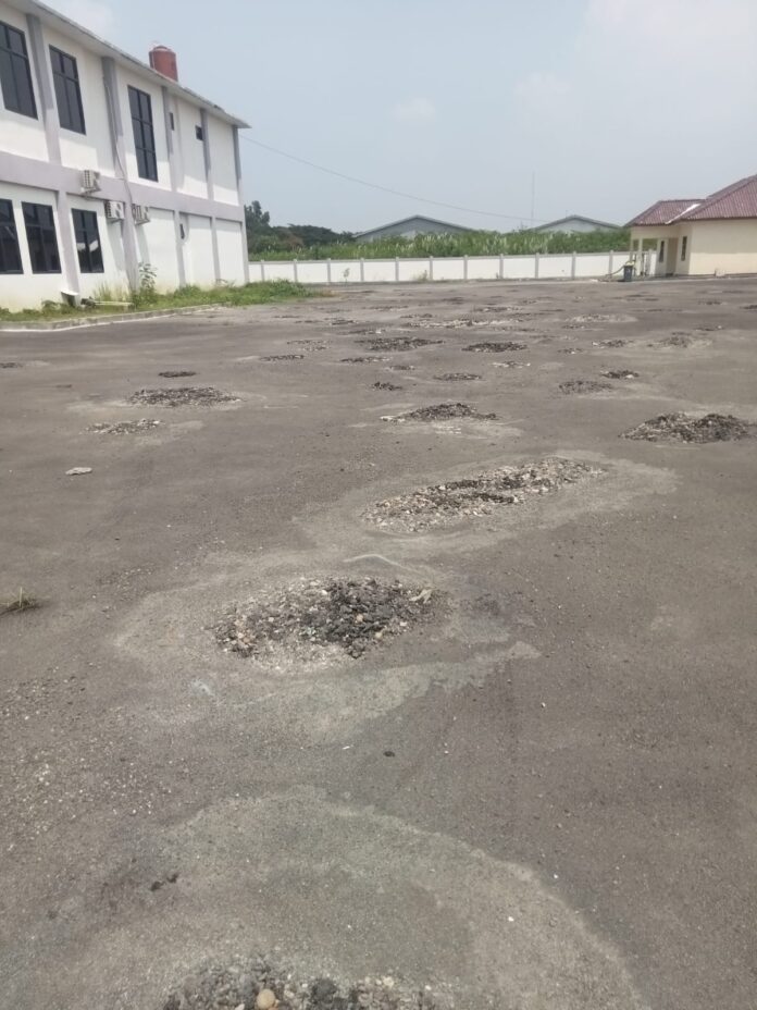 Berdasarkan pantauan di lokasi pada Senin (27/4/2026), aspal terlihat mengelupas di banyak titik. Puluhan lubang dengan diameter sekitar 20 sentimeter hingga lebih dari 1 meter tampak tersebar di area halaman. Kerusakan tersebut menyisakan batu dan kerikil, sehingga mengganggu aktivitas pegawai maupun masyarakat yang datang.